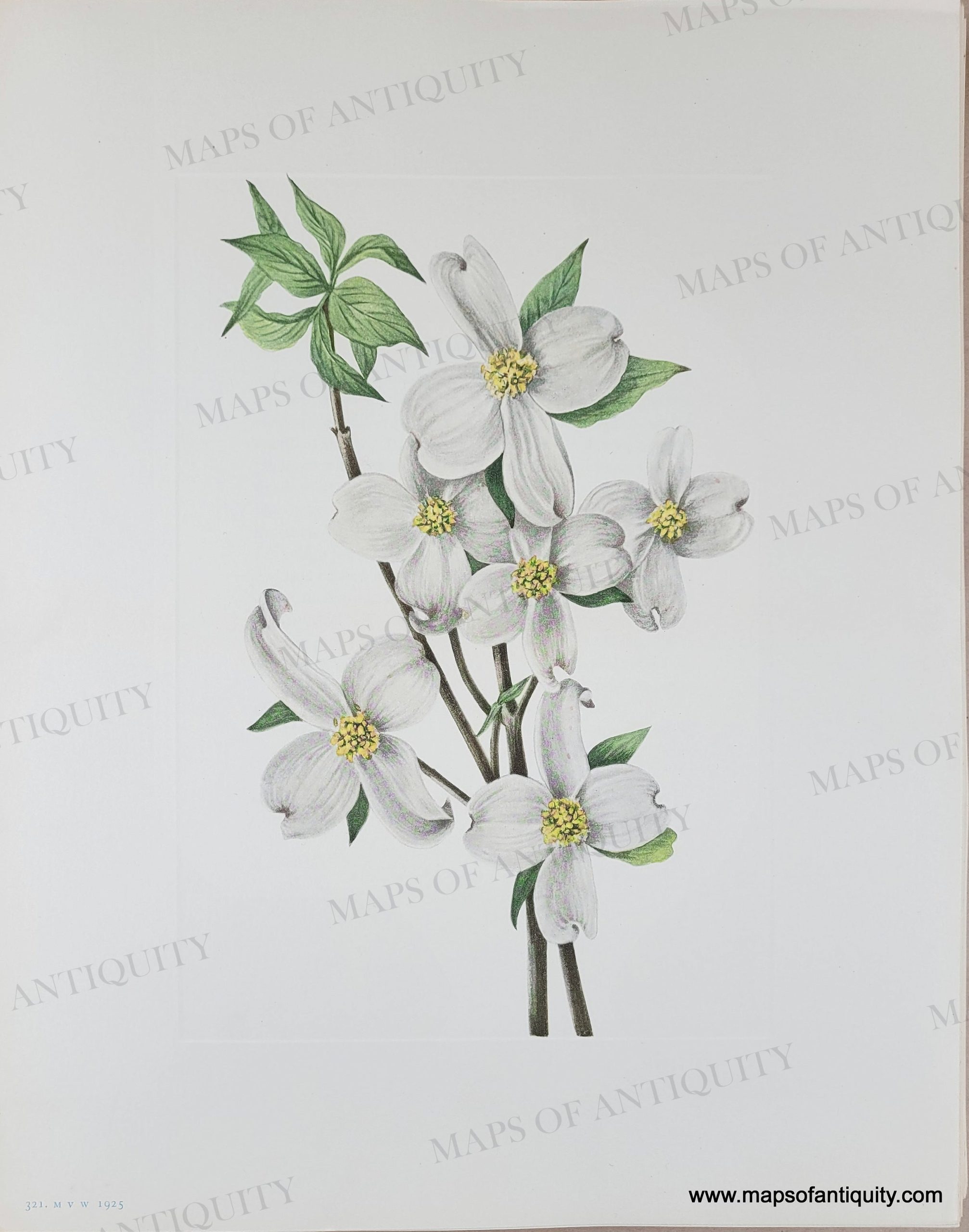 Antique botanical lithograph of Flowering Dogwood (flower). Cornus florida Linnaeus from North American Wild Flowers by Mary Vaux Walcott, published by the Smithsonian Institute, 1925. The cover booklet states: All sketches are life size. Each print is accompanied by a page with text describing the plant. Gorgeous original lithograph color. With plate mark. Page measures approx. 14 x 11 inches.