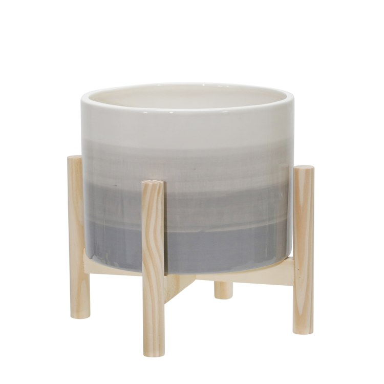 8″ Tonal Stripes Ceramic Planter with Wood Stand – Beige Mix Cheap Sale Excellent