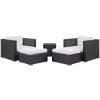 The five-piece set includes one Convene outdoor patio side table, two Convene outdoor patio armchair sections, and two Convene outdoor patio ottoman sections.