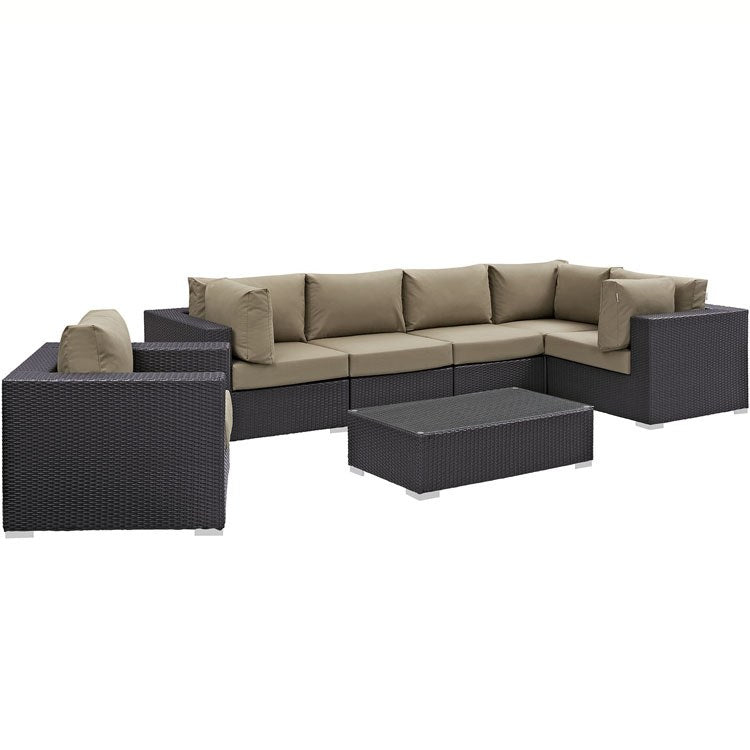 The seven-piece set includes one Convene outdoor patio armchair section, one Convene outdoor patio coffee table, three Convene outdoor patio corner sections, and two Convene outdoor patio armless chair sections.