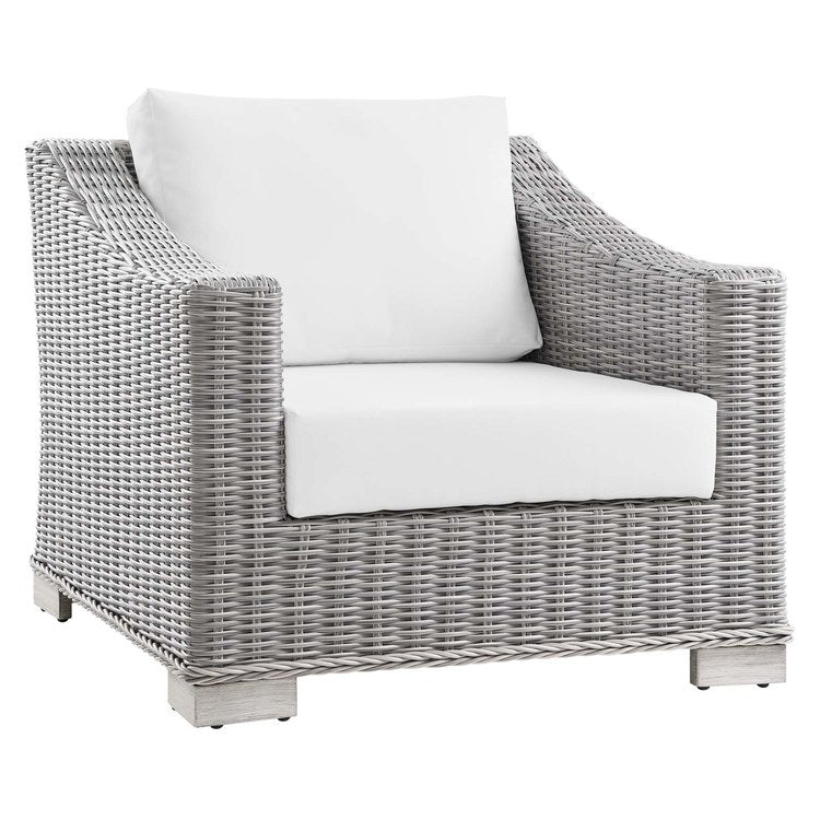 Enjoy fresh air and alfresco relaxation with the Conway Outdoor Patio Wicker Rattan Armchair. Wrapped in UV-resistant light gray synthetic wicker rattan, this patio chair boasts organic texture and a neutral hue that brings a calming presence to your outdoor space. The frame of this outdoor chair is crafted with durable powder-coated aluminum and rests on L-shaped legs with plastic foot glides. Thick foam padded cushions covered with removable, water-resistant polyester covers offer a comfortable seat and affix securely to the lounge chair with cord tension attachments. Trending aesthetics and a classic design define this outdoor patio furniture collection making it a beautiful addition to any outdoor space including the backyard, patio, porch, balcony, or poolside.