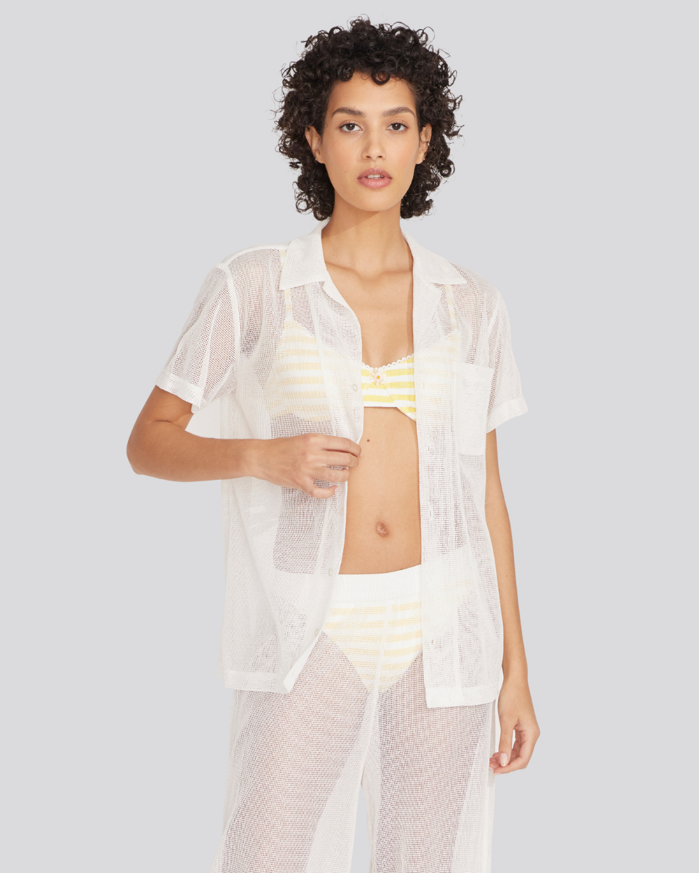 The Dahlia Top is the perfect piece to take your outfit from the beach to a lunch date. Pair this loose-fitting, lightweight, mesh button-down with the matching Delaney Pant to complete the look.
