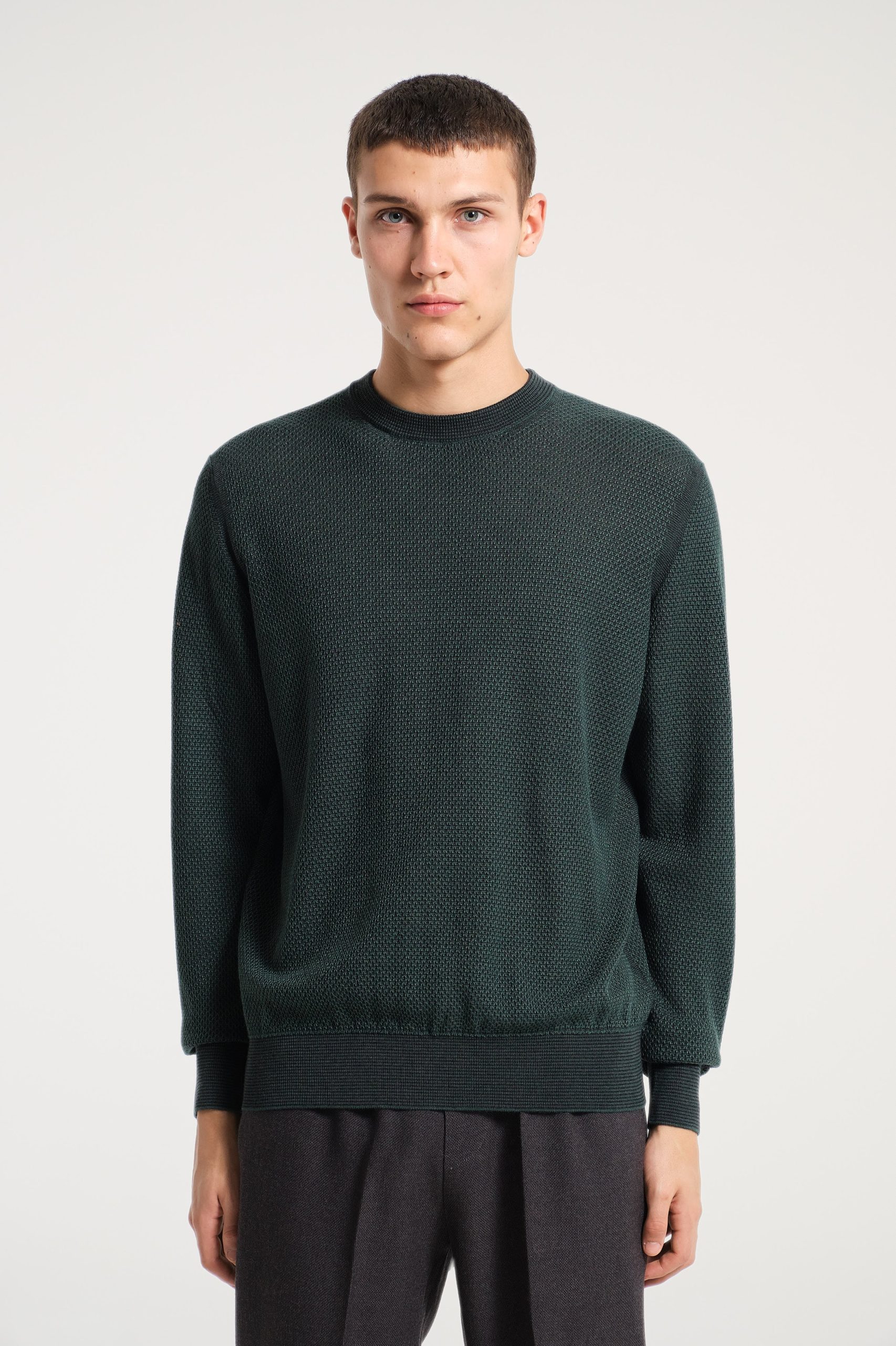Girocollo verde in lana seta e cashmere con rifiniture a slip stitch, un elegante tocco di artigianalità per un capo sofisticato. Questo capo presenta cuciture invisibili che conferiscono un aspetto impeccabile e pulito, mantenendo un design moderno e raffinato. Colore verde.