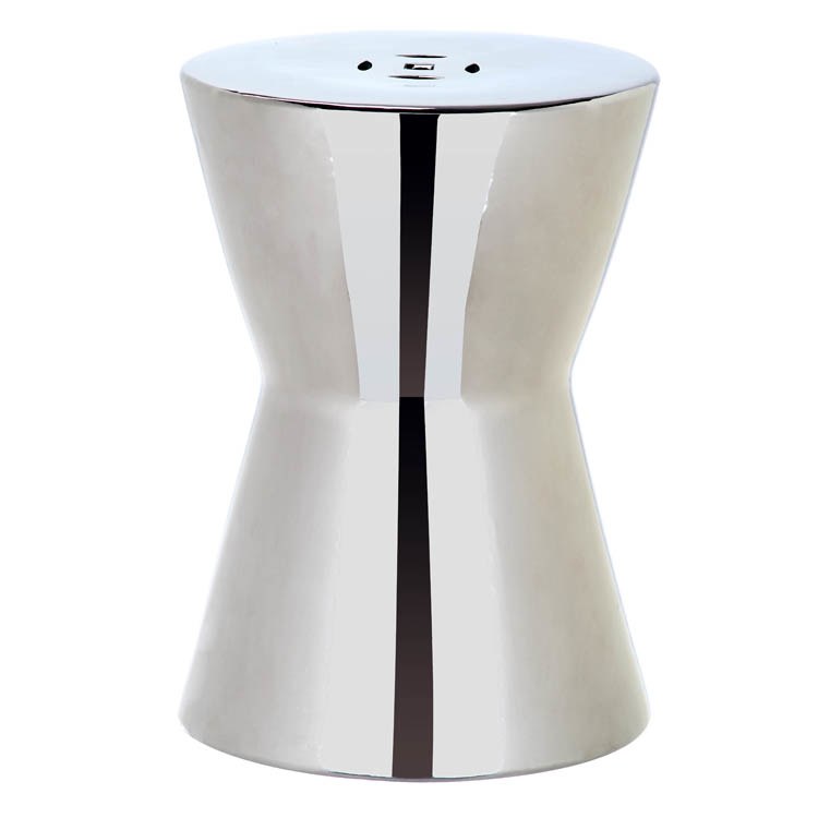 A modern classic, the glazed ceramic Liana indoor-outdoor garden stool is striking in luminous plated silver. Its geometric form works equally well beside a chair or in front of a sofa or bed, and can be used as a drink table, stool or footrest.