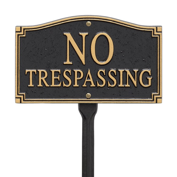 Get your message out in style with this custom cast sign. Each No Trespassing sign is cast in one piece from rust-free aluminum and coated with Whitehall’s exclusive tough Alumi-Shield finish to withstand all outdoor weather. Features a powder-coat finish in black and gold. Each sign includes an 18″ lawn stake for easy placement. Made in the USA.
