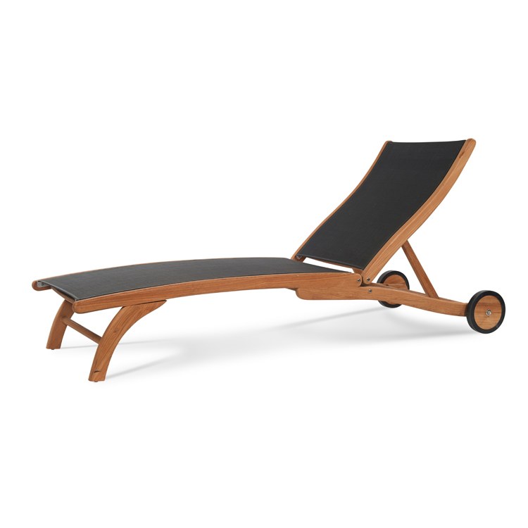 The Pearl Chaise Lounge is the perfect place for relaxation on the deck, by the pool, or anywhere in your outdoor space. The gracefully curving frame of premium teak is combined with a dura sling seat and back to provide comfort for hours without the need for a cushion, while a pair of wheels allow for easy adjustment and movement and a 5-position adjustable reclining back makes this the most comfortable sun lounger sold today. Shown here with Black dura sling