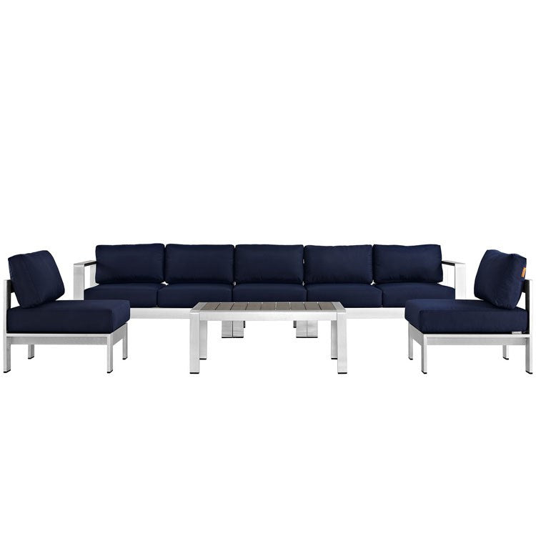 Enjoy your patio or backyard leisure time with the strong and durable Shore outdoor patio collection. Made of anodized brushed aluminum frames and non-marking black plastic foot caps, the Shore outdoor sectional sofa pieces come outfitted with resilient fabric canvas tested to last through all weather conditions. The Shore outdoor patio sectional furniture set complements casual gatherings with a chic look and ready versatility you can rely on.