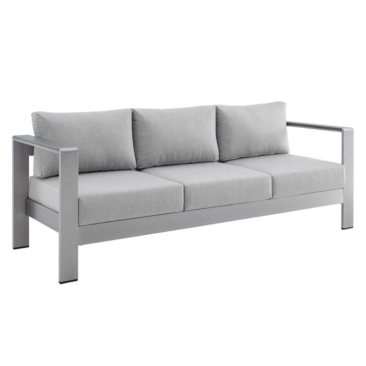 Enjoy your patio or backyard leisure time with the strong and durable Shore Outdoor Aluminum Sofa. Made with an anodized brushed aluminum frame and non-marking black plastic foot caps, Shore comes outfitted with resilient Sunbrella fabric canvas cushions tested to last through all weather conditions. The Shore Outdoor Aluminum Sofa complements your casual gatherings with a look and functionality you can rely on.