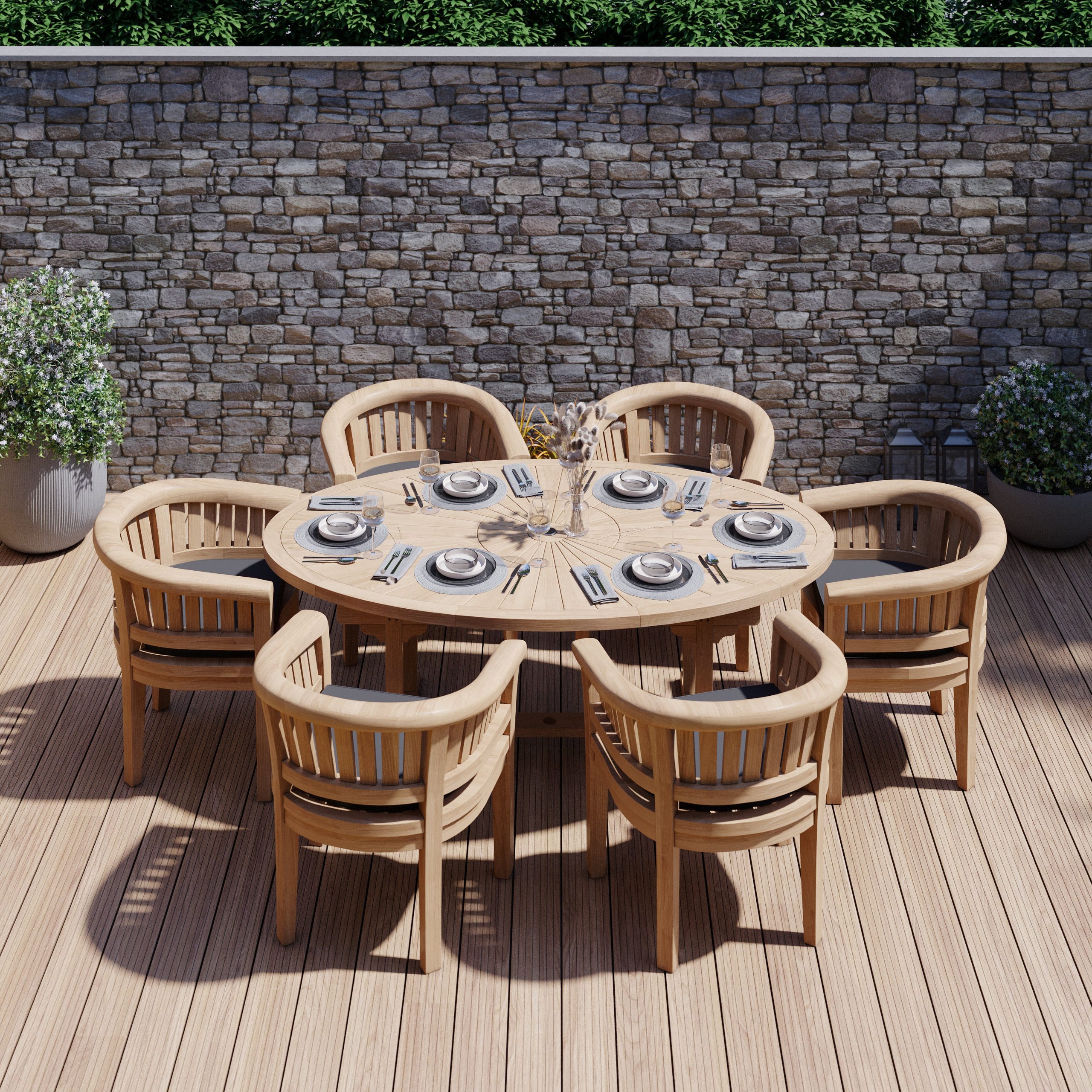Create a striking centrepiece in your garden with this Teak 2m Dining Set, designed for both comfort and convenience. The spacious Teak Outdoor Dining Table features a distinctive ‘Ray of Sunshine’ pattern on its thick 4cm tabletop, adding style to any outdoor setting. A built-in Lazy Susan allows for effortless sharing, making mealtimes more relaxed and sociable. With enough space to seat up to 8 people, this set is ideal for family meals, summer evenings with friends, or entertaining guests in style.