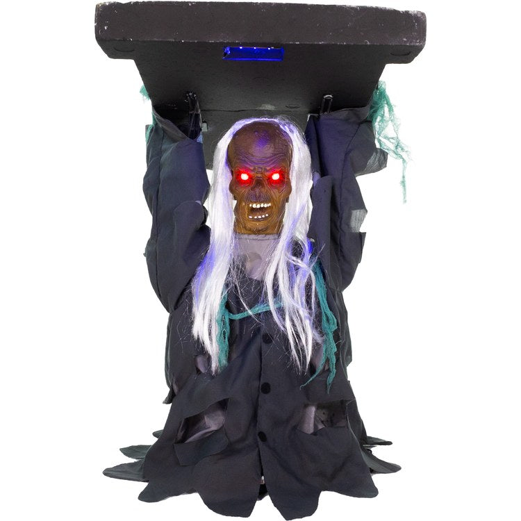 Partnering with Tekky Toys, a leader in premium Halloween animatronics, Haunted Hill Farm brings you thisassortment of past bestsellers now exclusively available through Haunted Hill Farm. These sound-activated, lifesize props are designed with high quality details and realism for the perfect addition to your scary Halloween decor. The Tombstone Lifter will give guests the fright of their lives with a single glance. His animated body will start lifting the tombstone when a loud sound is detected while his red LED light eyes glow, giving him a sinister stare. Various evil moans and laughter will chase off trick-or-treaters throughout the night. For longer prop life, we recommend indoor or sheltered outdoor use protected from inclement weather. Choose the Tombstone Lifter to create a unique spooky display near the front door, on your porch, at the office, or inside your home to scare your family, friends, and neighbors.