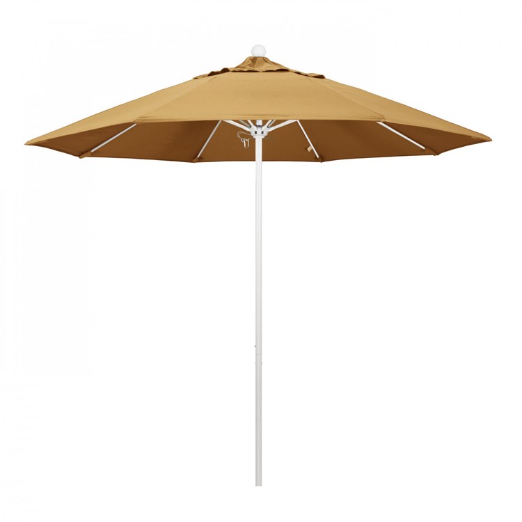 This heavy-duty, 9-foot, commercial-grade umbrella by California Umbrella offers all the features a residential or commercial owner demands, with a robust commercial-grade aluminum frame. The 2 section aluminum pole with a 0.08 inch wall thickness and fiberglass rib framework has superior stability and is perfect for demanding commercial conditions. The strong aluminum pole frame is matched by a simple efficient push lift system that complements a resilient easy to use umbrella. One of the key benefits to this umbrella is a 3 year warranty on the fiberglass ribs as a opposed to your standard one year warranty. This umbrella also features Sunbrella fabrics, which are built on a foundation of solution-dyed acrylic yarn, the most resilient and solid material for prolonged sun exposure, to offer even longer color retention rating than competing material sources. This umbrella will hold up against anything you throw at it; it has the benefits of both worlds.