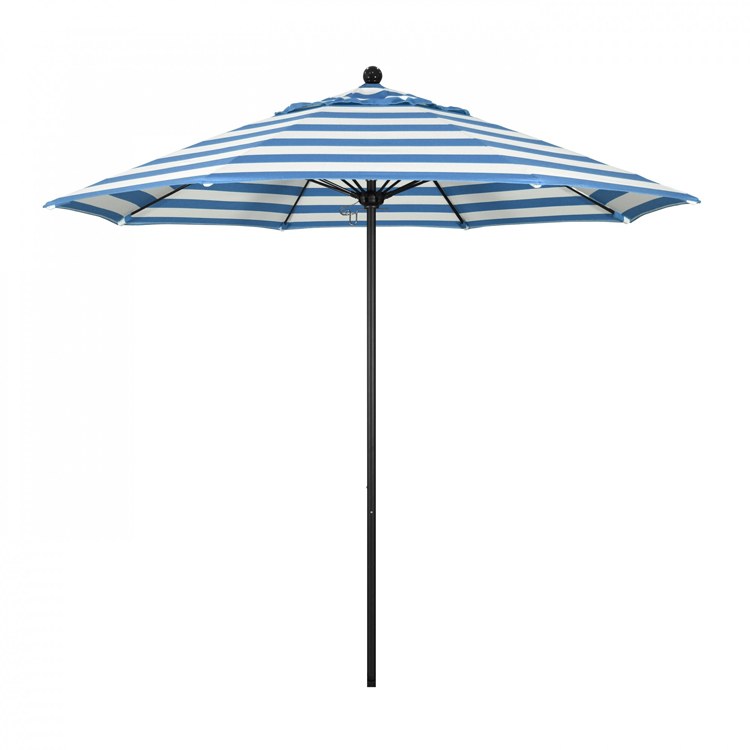 This heavy-duty, 9-foot, commercial-grade umbrella by California Umbrella offers all the features a residential or commercial owner demands, with a robust commercial-grade aluminum frame. The 2 section aluminum pole with a 0.08 inch wall thickness and fiberglass rib framework has superior stability and is perfect for demanding commercial conditions. The strong aluminum pole frame is matched by a simple efficient push lift system that complements a resilient easy to use umbrella. One of the key benefits to this umbrella is a 3 year warranty on the fiberglass ribs as a opposed to your standard one year warranty. This umbrella also features Sunbrella fabrics, which are built on a foundation of solution-dyed acrylic yarn, the most resilient and solid material for prolonged sun exposure, to offer even longer color retention rating than competing material sources. This umbrella will hold up against anything you throw at it; it has the benefits of both worlds.
