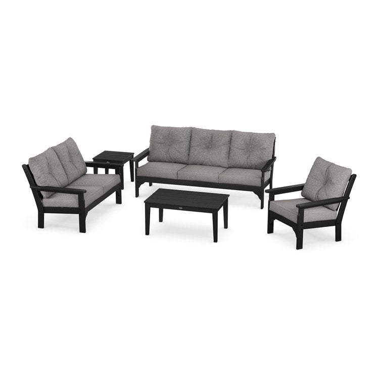 The Vineyard 5-piece deep-seat set seats up to six and will bring a cozy living room feel outdoors to your porch or patio. Complete with supportive seat cushions and soft buttoned back pillows covered in durable performance fabric, this low-maintenance set also provides space for snacks and drinks on the roomy end table and coffee table.
